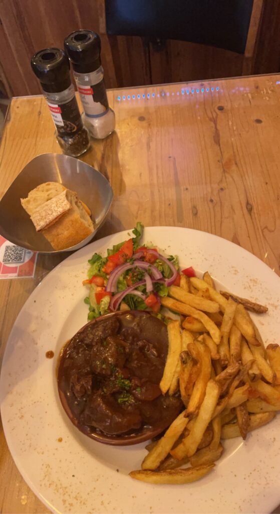 Nearly getting run over within 30 seconds of leaving the taxi, I realized that I needed to be attentive to my surroundings. I check into the hotel and look up the directions to the building that the director told me to go to in order to receive the welcome materials from the program. Thankfully, it was a quick five minutes away, and by then I had started to remember my surroundings. Feeling more confident in myself, me and the person I’m sharing a room with go to a nearby Bistro for some dinner. On the menu, I see ‘steak’ and assume it was a fully cooked, hot, slab of beef. Instead, it turned out to be beef tartare – which is raw beef, mixed with raw egg, green onions, capers, salt, and served with bread. Being from Europe originally, eating raw food like beef was something that I was used to. Caught feeling somewhere between confused, disappointed, and curious, as well as absolutely starving, I end up trying it and to my surprise, it was one of the nicest meals I’ve ever eaten. After eating this, drinking a couple glasses of very affordable, yet amazing glasses of wine, me and my friend go into the city to explore a little more.