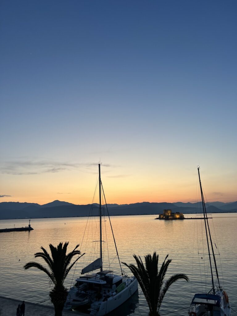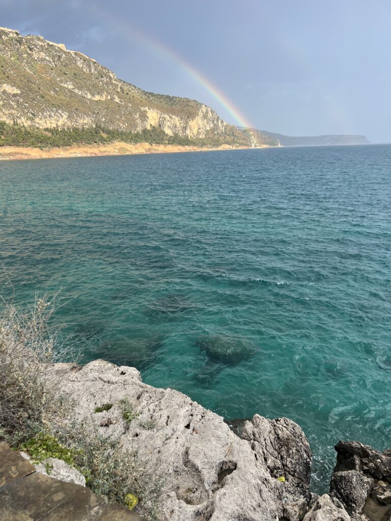 Some other sites we visited on the rest of our trip were the Temple of Apollo in Delphi, the Archaeological Site of Olympia, the Palamidi Fortress in Nafplio, and the Treasury of Atreus. We saw many more sites than this, but listing them all would take up a whole page due to the high number of places and artifacts we were able to see in such a short amount of time. In addition to the historic sites, we also saw unbelievable scenery from rolling mountain ranges, to serene beaches overlooking the Aegean sea, to the vibrant city of Athens. In each of the places we went, we also had some incredible cultural experiences. We attended two cooking classes (one of which took place at an olive farm), danced with Greek people to traditional music, raced on the original running track of the Olympic games, tried new foods, pet a thousand cats, and became acquainted with the Greek people who are so incredibly kind.