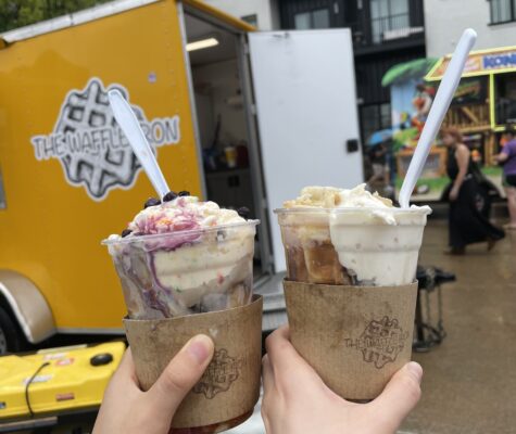 There were so many trucks, which were selling not only food, but also jewelry, flowers, and so on. I got a waffle with ice …