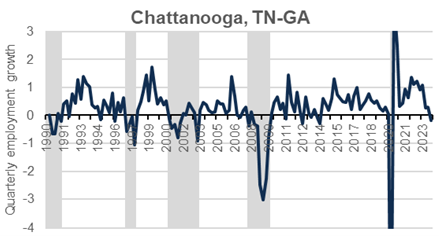 Although recessions are usually thought of as national-level events, there can be substantial differences across states and metro areas in when they occur. This paper determines and compares the timing of recessions for Chattanooga and four nearby metro areas. The shaded areas in the chart are the periods of recession in the Chattanooga metro area. In part because it experienced its own recession in 1997, recession has been more common in Chattanooga than elsewhere since 1990. This fact combined with its relatively large manufacturing sector and relatively small education and health sector has meant that Chattanooga’s job losses during recessions have tended to be larger than average. Chattanooga’s continuing reliance on manufacturing suggests that future recessions will be as costly as past ones. On the other hand, the area’s manufacturing sector has been transformed and is much more competitive than during previous recessions.