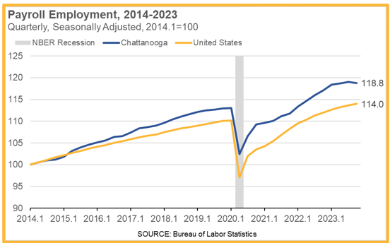 Over the past decade, the economy of the Chattanooga metro area has outperformed that of the country as a whole. Between January 2014 and December 2023, the number of nonfarm jobs (also called payroll employment) rose by 18.8 percent in the Chattanooga metro area, but by only 14 percent in the United States. The COVID pandemic and its aftermath certainly left its mark along the way, but Chattanooga and the United States both have recovered roughly to the levels of employment they would have had if pre-pandemic trends had continued. The good news for Chattanooga is that the positive boost in its trend prior to the pandemic appears to have become the new normal.