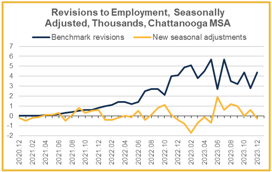 In March, the Bureau of Labor Statistics (BLS) released revised estimates of state and metro area nonfarm employment. As a result, more than 4 thousand jobs were added to the estimated total employment in the Chattanooga metro area. Revisions of this sort are an annual occurrence and can lead to dramatic changes in what we think happened in the past. This year’s revisions, for example, indicate that three-year job growth for 2021-2023 was 25.9 thousand rather than the already booming 21.6 thousand. These numbers will be revised again in a year when estimates for 2021 and 2022 are subject to routine tweaking and the estimates for 2023 get new benchmarks. Revisions of the scale seen this year are not unusual, but they have become more common since the COVID pandemic.
