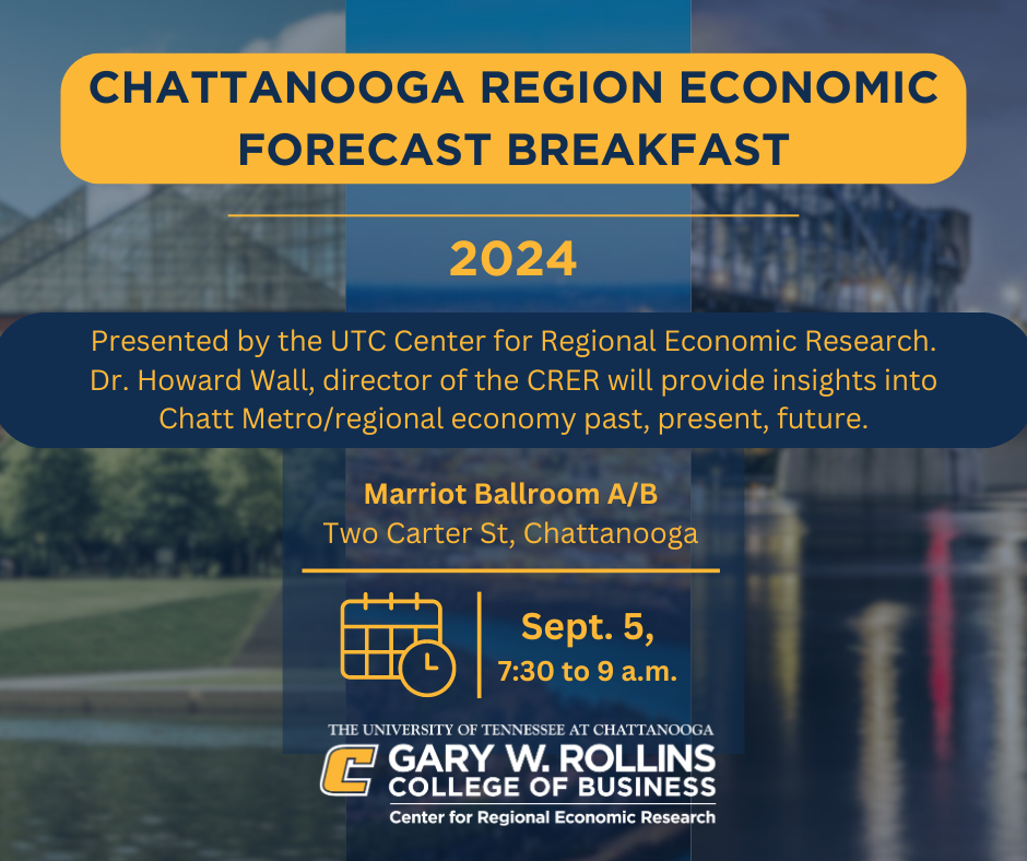 The CRER released its forecasts for the Chattanooga economy at its First Annual Regional Economic Forecast Breakfast. CRER director Howard Wall provided an overview of the past, present, and future of the Chattanooga MSA economy. He also presented the CRER’s new forecasting model and its forecasts for employment growth through 2025.