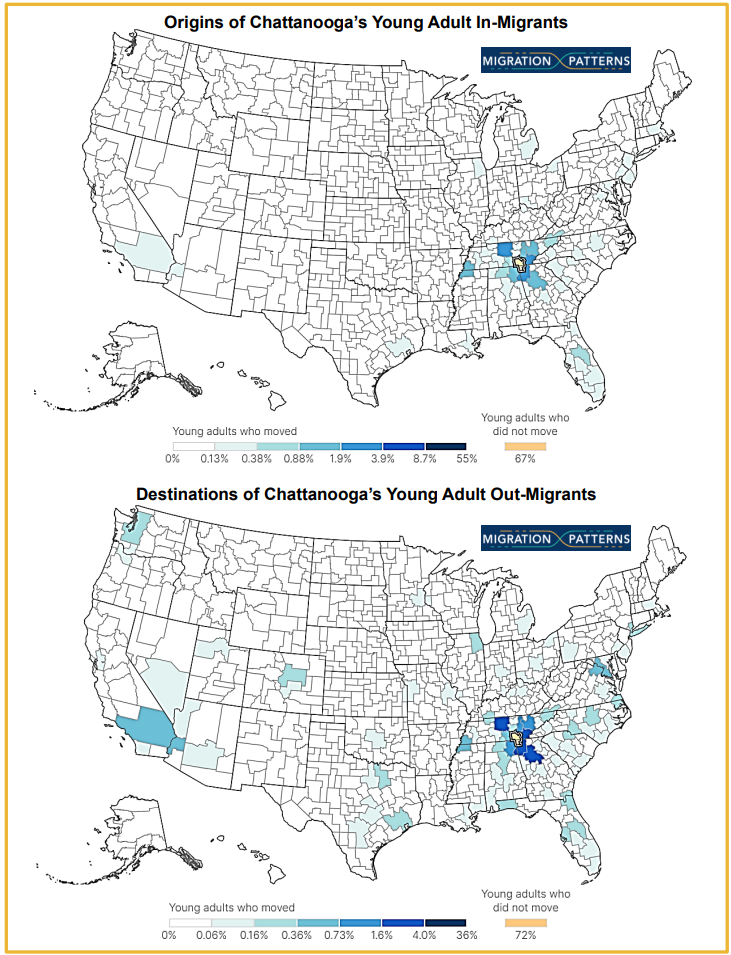 Recent CRER research on the origins and destinations of Chattanooga’s young migrants was featured in the Chattanooga Times Free Press. The research uses a unique dataset on the migration of young adults between commuting zones to analyze the most common origins and destinations of Chattanooga’s young adult migrants. Many more young adults moved into Chattanooga than moved out of it, but Chattanooga’s net in-migration rate was much lower than those for large areas such as Nashville and Atlanta. Generally, there was a hierarchy of migration according to area size: Chattanooga received many more young adult migrants from small areas nearby but sent many more to large areas both near and far away. Parental income was strongly related to the likelihood of migration and the destinations and origins of Chattanooga’s young adult migrants.