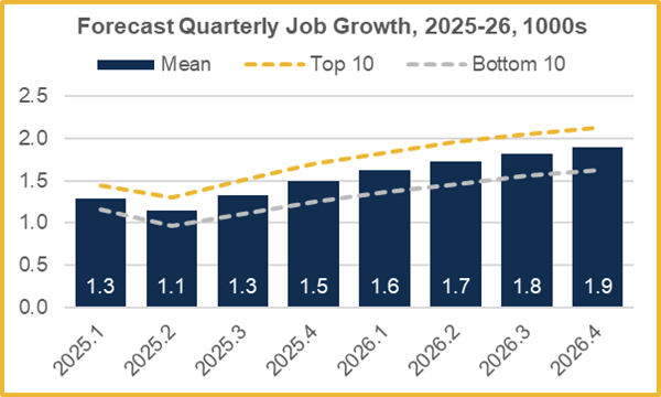 Partly because Chattanooga’s fourth quarter job growth was weaker than expected, the near term outlook has been downgraded. The CRER’s previous forecast was for job growth of at least 1.5 thousand per quarter throughout 2025, for a total of 6.7 thousand more jobs by the end of the year. The new forecast is for positive but weak job growth early in the year and for annual job growth of 5.3 thousand.