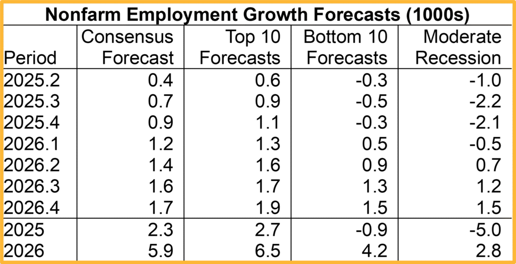 In light of the ever-changing national situation and outlook, the CRER has released a special forecast outside of its regular schedule of quarterly forecasts. The CRER’s updated forecast provides three scenarios based on the Blue Chip survey, and one based on the occurrence of a moderate recession along the lines of the 1990 and 2001 recessions. Under the consensus forecast for the US economy, local job growth would be slow throughout 2025 and pick up in 2026. The two recession scenarios (mild and moderate) indicate a loss of 900 and 5,000 jobs in 2025, respectively, along with slow growth in 2026. Under the most optimistic scenario, the local economy would gain 2,700 jobs in 2025, which would be the slowest annual growth since 2014.