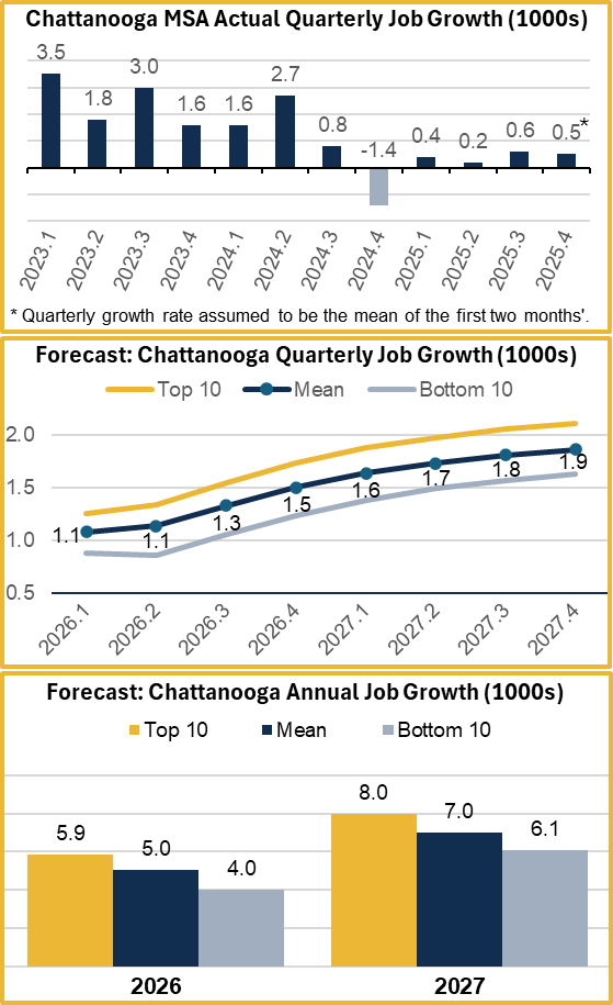 The CRER produces quarterly forecasts of payroll employment growth for the six-county Chattanooga metro area. The latest forecast indicates net job gains of about 5,000 during 2026, which would be a big improvement over 2025. Even so, that would make the year a weak one relative to recent history. Job growth should return to normal levels in 2027 as long as the U.S. economy returns to its normal performance.