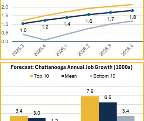 The CRER produces quarterly forecasts of the growth of nonfarm payroll employment in the Chattanooga MSA. Forecasts depend on the consensus forecast of the U.S. economy from the Blue Chip Economic Indicator survey. Our new forecast is a net gain of one thousand jobs in the third quarter, and for growth to slowly return to…