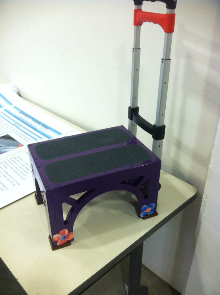 The portable toilet stool is 9 inches tall, 15 inches wide, and 11 inches deep. The base of the stool is made out of pinewood and held together by wood screws. On the top of the stool, skateboard grip tape is used to prevent slipping. On each of the legs, rubber shoes were cut out and then glued onto the bottom to prevent the stool from sliding along the floor. The wooden pieces of the stool were designed in Solid Works and then fabricated with a CNC (Computer Numeric Controlled) Router. Arches and flowers were cut into the sides of the stool to make the stool more lightweight. The top plate of the stool was pocketed to also help take the weight off of the stool. A collapsible handle and two cast iron wheels were attached to the front of the stool so that when pulled, it would roll similar to a suitcase. Serinity’s favorite colors were used to paint the stool so that it would appeal to her. The stool was painted a purple base with blue and pink flowers.