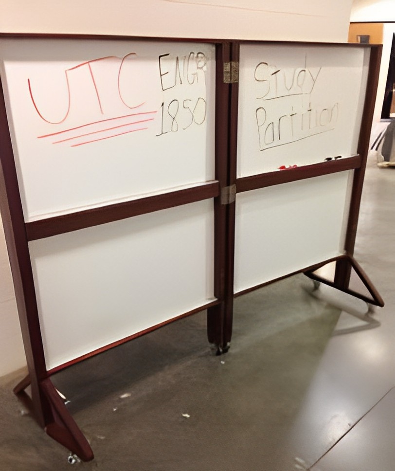 The study partition can be used in many different ways. First and foremost, the main use of the system is to separate the students who are using the two computers from the rest of the class. The same goes for the students not using the computers. It is a visual blocking device in its most basic element. Another way the study partition can be used is to create a physical barrier that would enable the teacher to have full awareness of the entire class. The last way this device can be used in a positive way is to allow the students to draw creatively on the whiteboards. This would give the students a chance to help them to express themselves artistically.