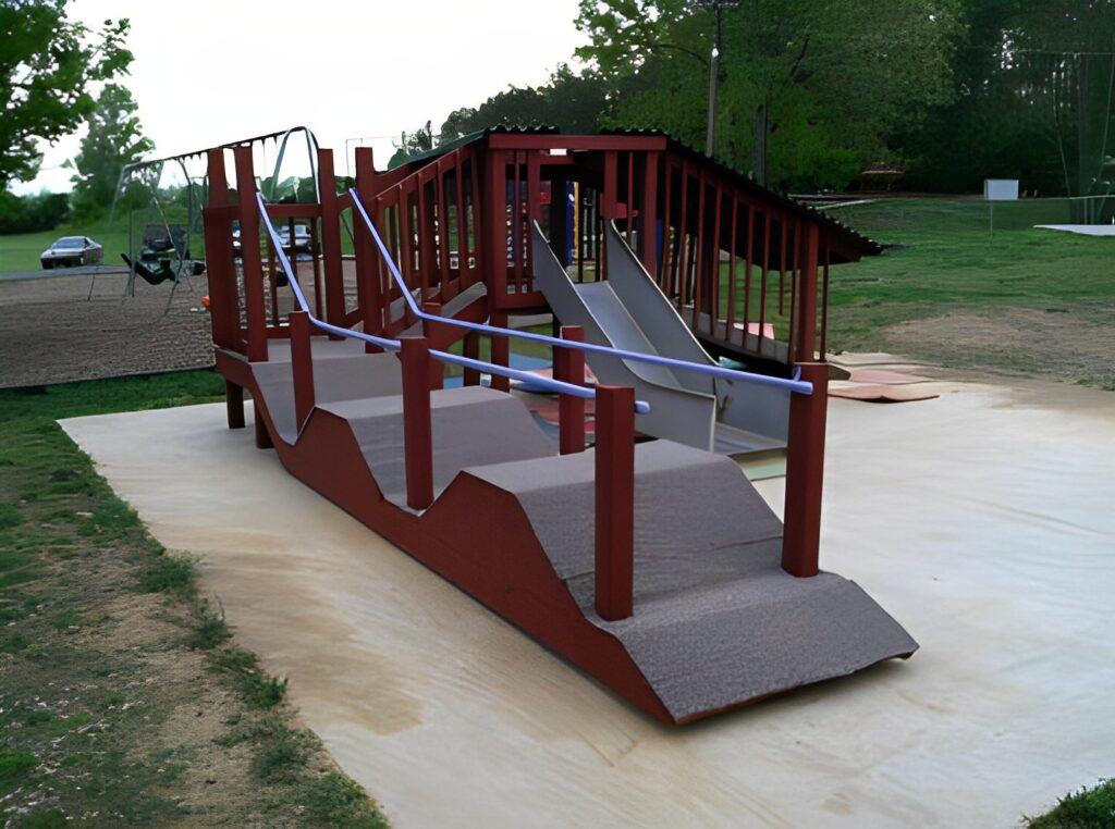 Christina, but it is obvious that since the device is on a playground, the structure will be used in several different ways by the children. The intended use is as follows: 1) The user that is in the existing playground equipment will crawl down the first incline to the elevated, level platform connecting the therapy section to the existing structure. 2) The user will grab the handrails for support and either crawl or walk down the second decline ramp to the ground-level therapy section. 3) Using the handrails on each side, the user will support themselves and navigate through the parallel bar section with the incline/decline table tops designed to stretch the user.