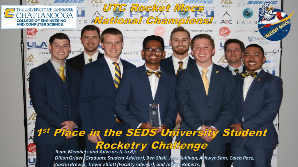The UTC Rocket Mocs won 1st place in the Students for the Exploration and Development of Space University Student Rocketry Challenge. Since UTC last competed in the challenge, EDS has grown from more than 80 chapters across the country to 113 chapters, including at Purdue University, Arizona State University, MIT and Tennessee Tech University. The Rocket Mocs team represented UTC at the SpaceVision conference, where presentation of their design and the altitude and velocity it achieved drew gasps of surprise. It is believed that the Rocket Mocs’ winning altitude of 11,563 feet is the highest in competition history, and the world record altitude for this combination of motors and specific impulse is only 3,500 feet higher.