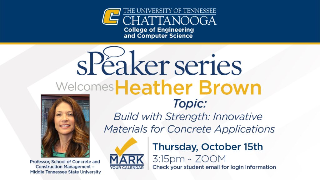 We at the College of Engineering and Computer Science of UTC were thrilled to host Dr. Heather Brown, accomplished professor at MTSU, for a talk entitled “Build with Strength: Innovative Materials for Concrete Applications.” Dr. Brown began at MTSU in 2001, and was the department chair of the School of Concrete and Construction Management from 2011 to August of this year. Additionally, she has done research for the Tennessee Department of Transportation, and has been recognized by MTSU as a “faculty member who makes a difference,” and by Rutherford County and National Concrete Construction as an “influential woman in business” in 2015 and 2017 respectively. She has been inducted into the Tennessee Concrete Hall of Fame; she is accompanied by a host of other credentials, a far-reaching area of expertise, and an extensive curriculum vitae.