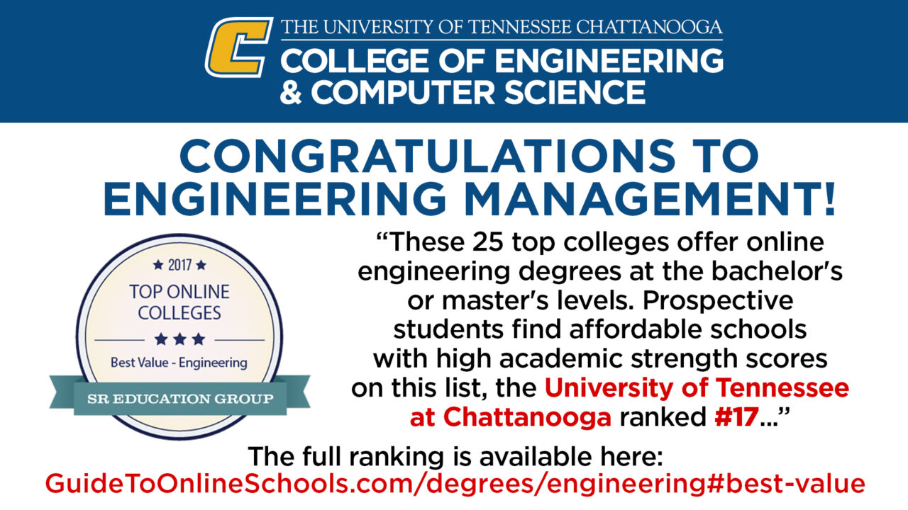 The University of Tennessee - Chattanooga is ranked #17 in the 2017 Top Online Colleges for Engineering Degrees by SR Education …