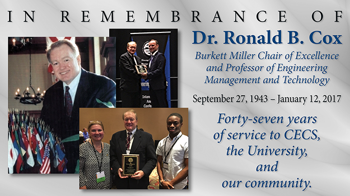 Dr. Ronald B. Cox, Burkett Miller Chair of Excellence and Professor of Engineering Management and Technology passed away on …