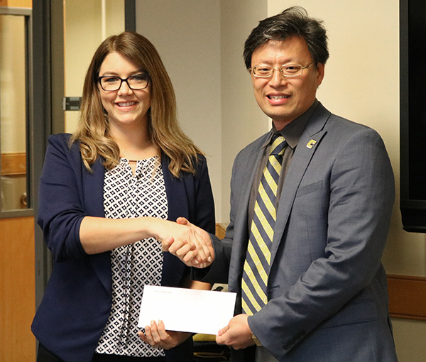 Daniel Pack, dean of the College of Engineering and Computer Science, accepts a $15,000 commitment from Volkswagen from the …