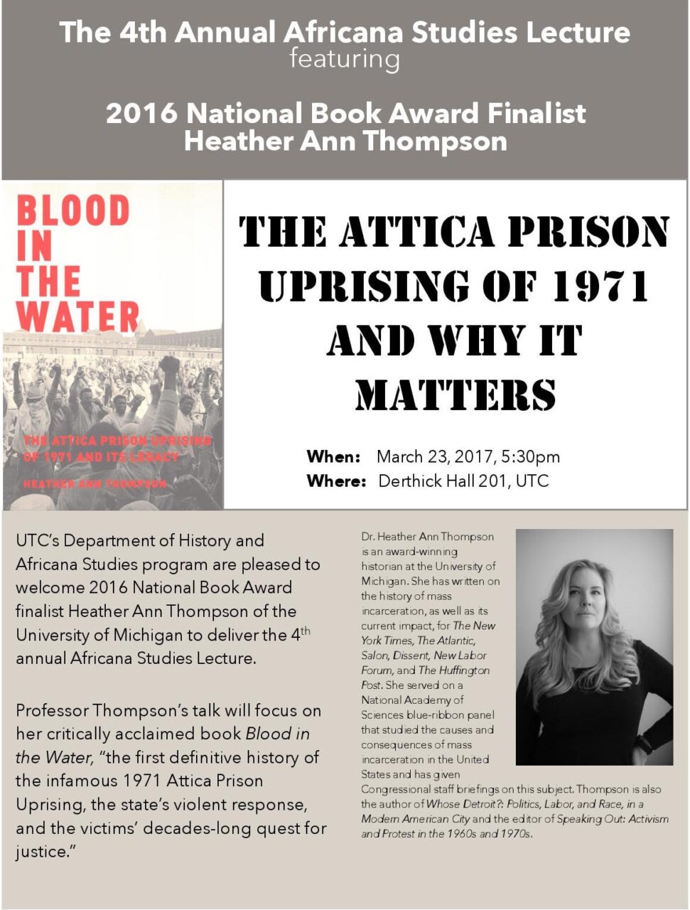 UTC’s Department of History and Africana Studies program are pleased to welcome 2016 National Book Award finalist Heather Ann Thompson of the University of Michigan to deliver the 4th annual Africana Studies Lecture on Thursday, March 23, at 5:30pm in Derthick Hall 201.