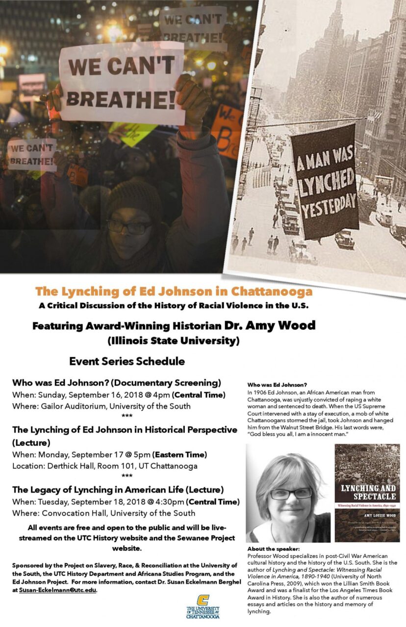 *UTC’s Department of History and the Africana Studies program are pleased to welcome 2010 Lillian Smith Book Award recipient and Los Angeles Times Book Award finalist Dr. Amy Wood of Illinois State University to deliver the 5th annual Africana Studies Lecture on Monday, September 17, at 5pm (Eastern Time) in Derthick Hall 101. Free and open to the public, Professor Wood’s talk will present a historical perspective on the 1906 lynching of Ed Johnson. Questions may be directed to event organizer Dr. Susan Eckelmann Berghel at [email protected] or (423) 425-5621. Attendees in need of accommodations are invited to contact UTC’s Disability Resource Center at 423-425-4006.