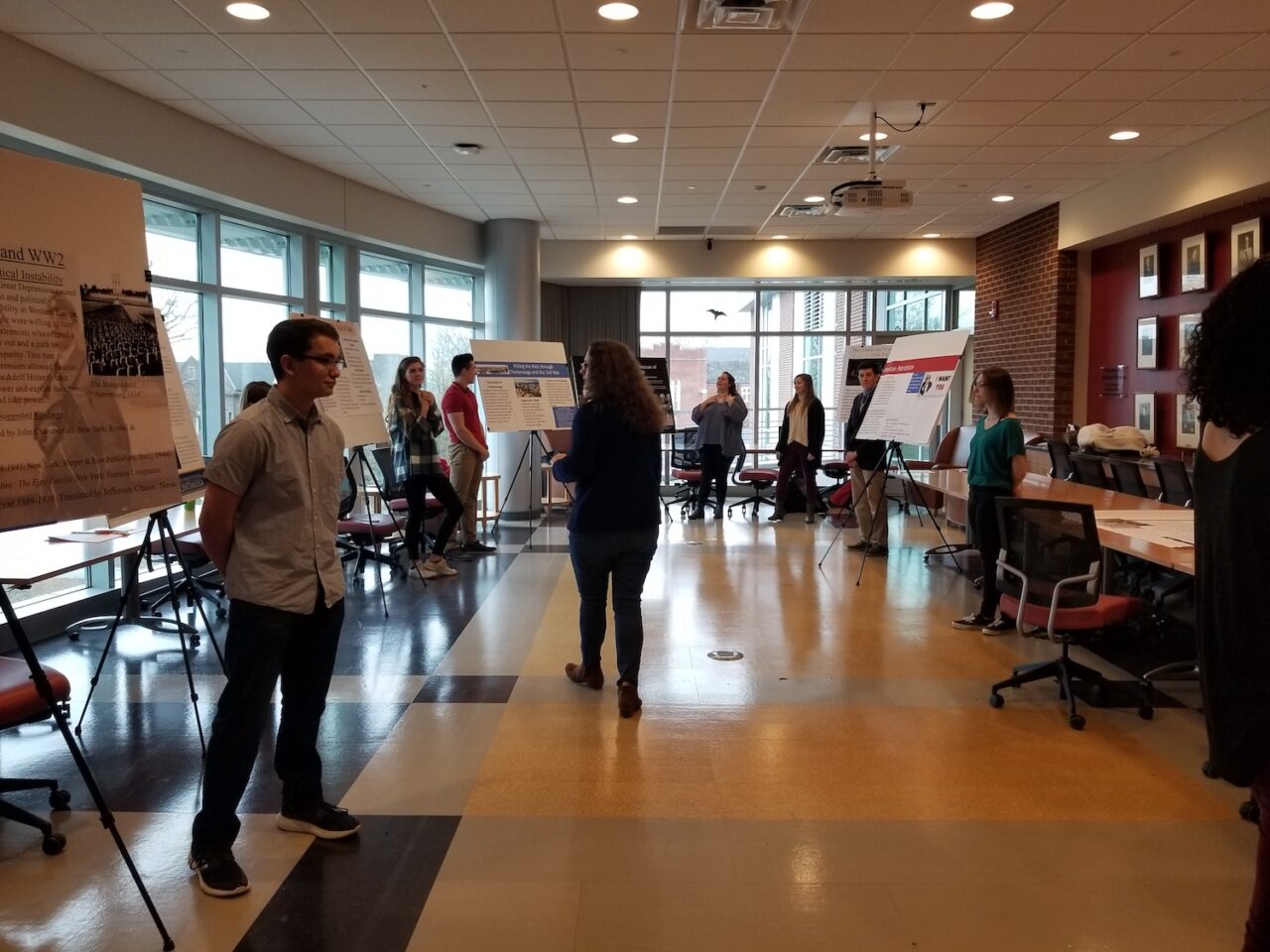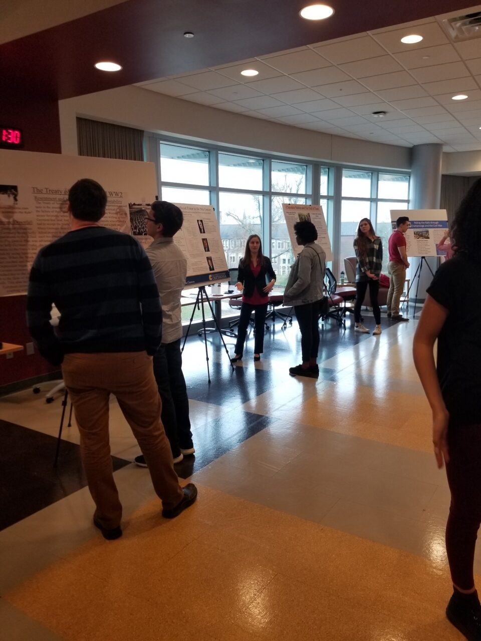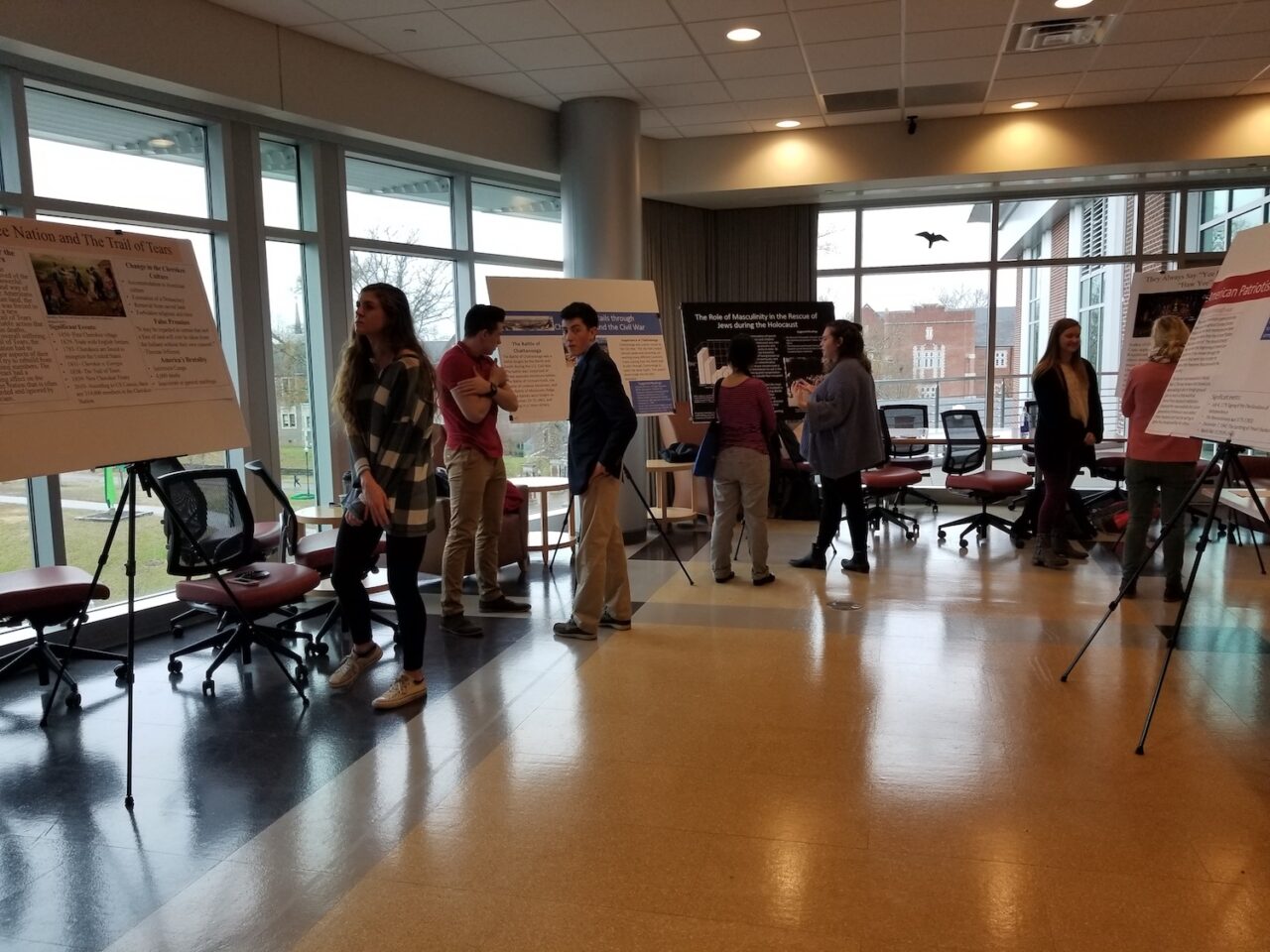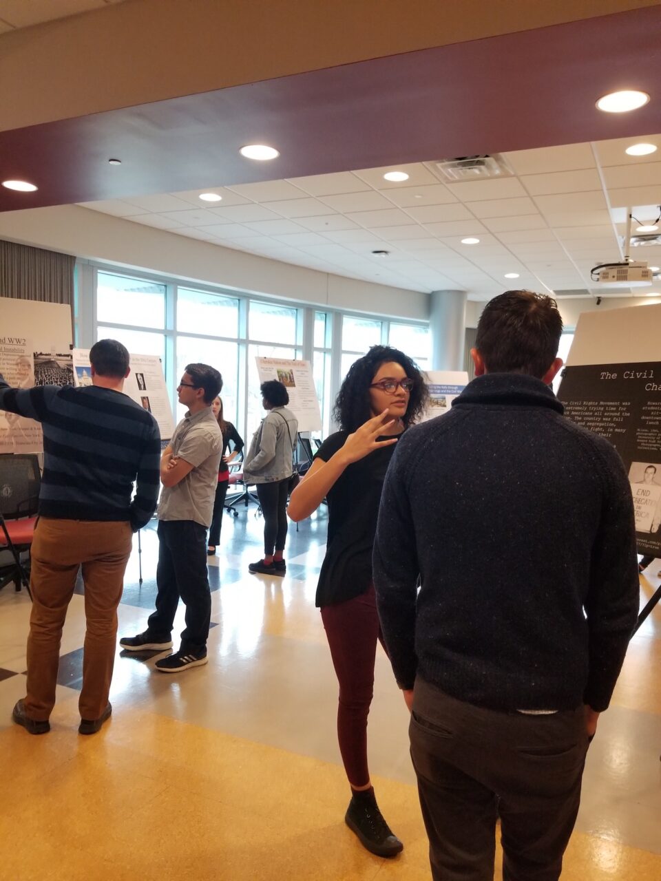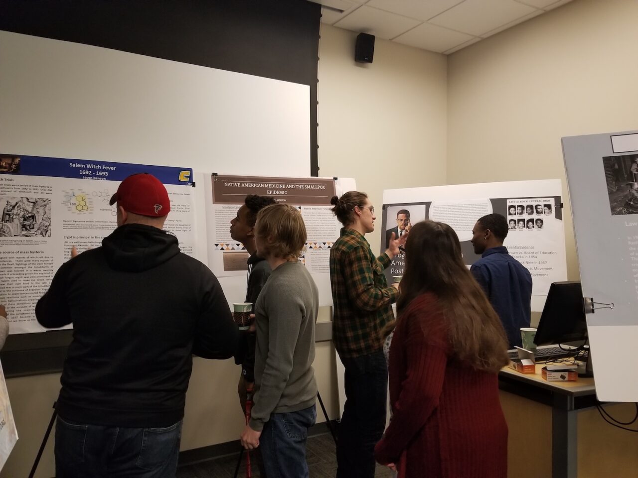 At the end of the Fall 2018 semester, students from sections 0 and 03 of Writing and Research in History showcased the posters they created for the class. The course was designed to help students learn to evaluate primary and secondary materials and use those sources to develop and answer research questions. Students in the class were required to complete a historical research paper on a topic of their choice. In addition, they created posters depicting the major points of their research project. Students then presented these posters during two conference-like sessions, attended by faculty and staff from the Department of History and others.