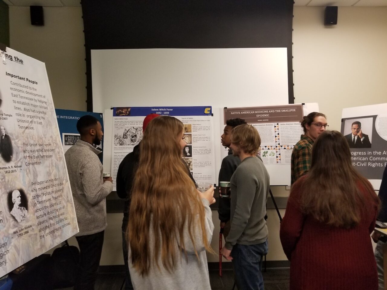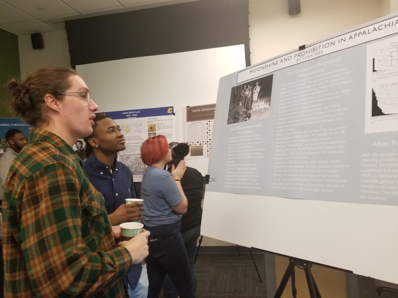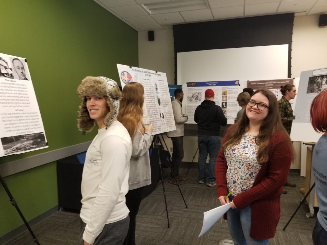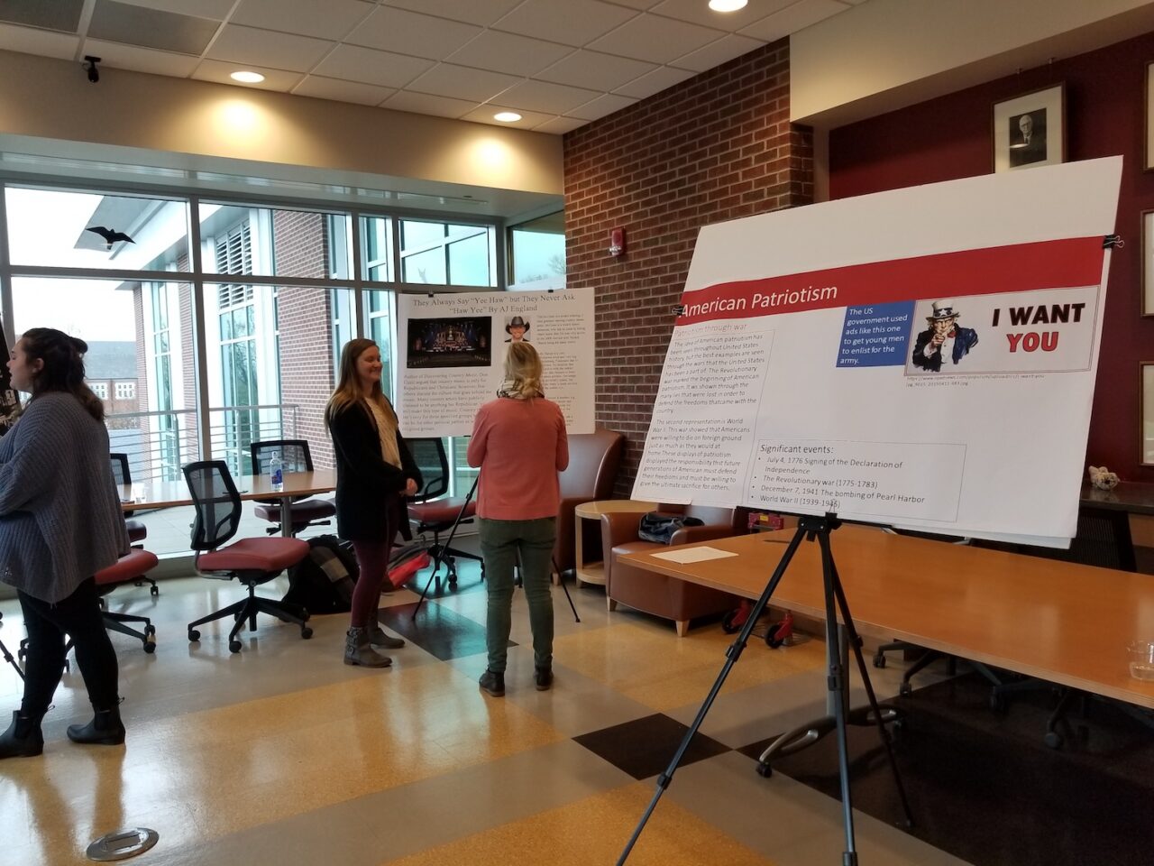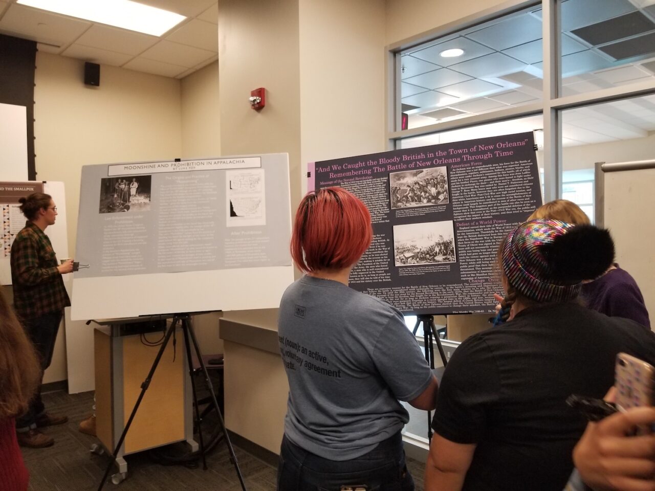 At the end of the Fall 2018 semester, students from sections 0 and 03 of Writing and Research in History showcased the posters they created for the class. The course was designed to help students learn to evaluate primary and secondary materials and use those sources to develop and answer research questions. Students in the class were required to complete a historical research paper on a topic of their choice. In addition, they created posters depicting the major points of their research project. Students then presented these posters during two conference-like sessions, attended by faculty and staff from the Department of History and others.