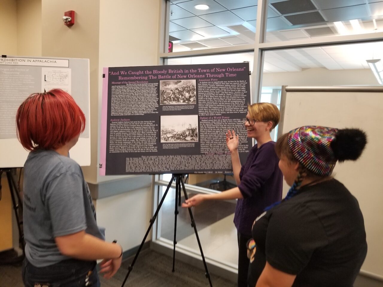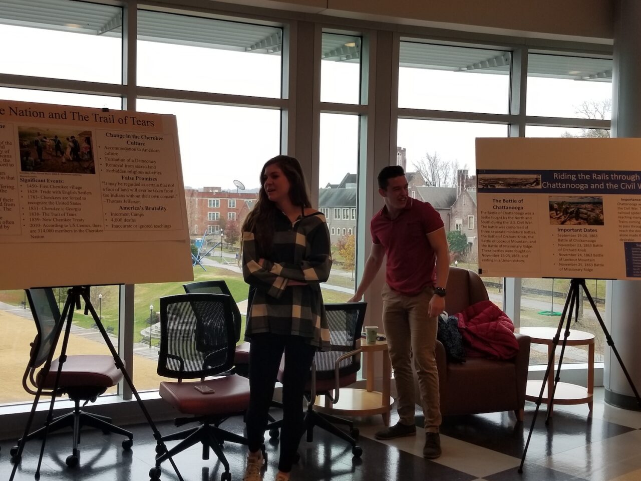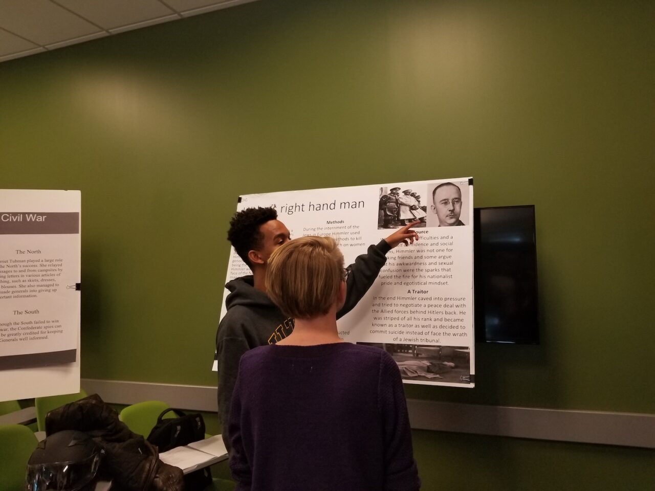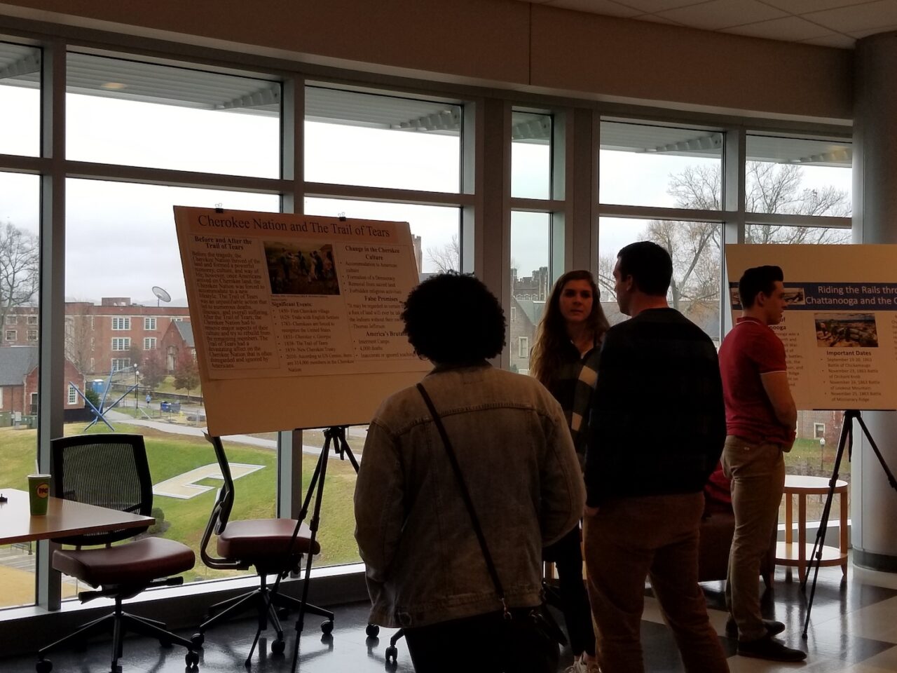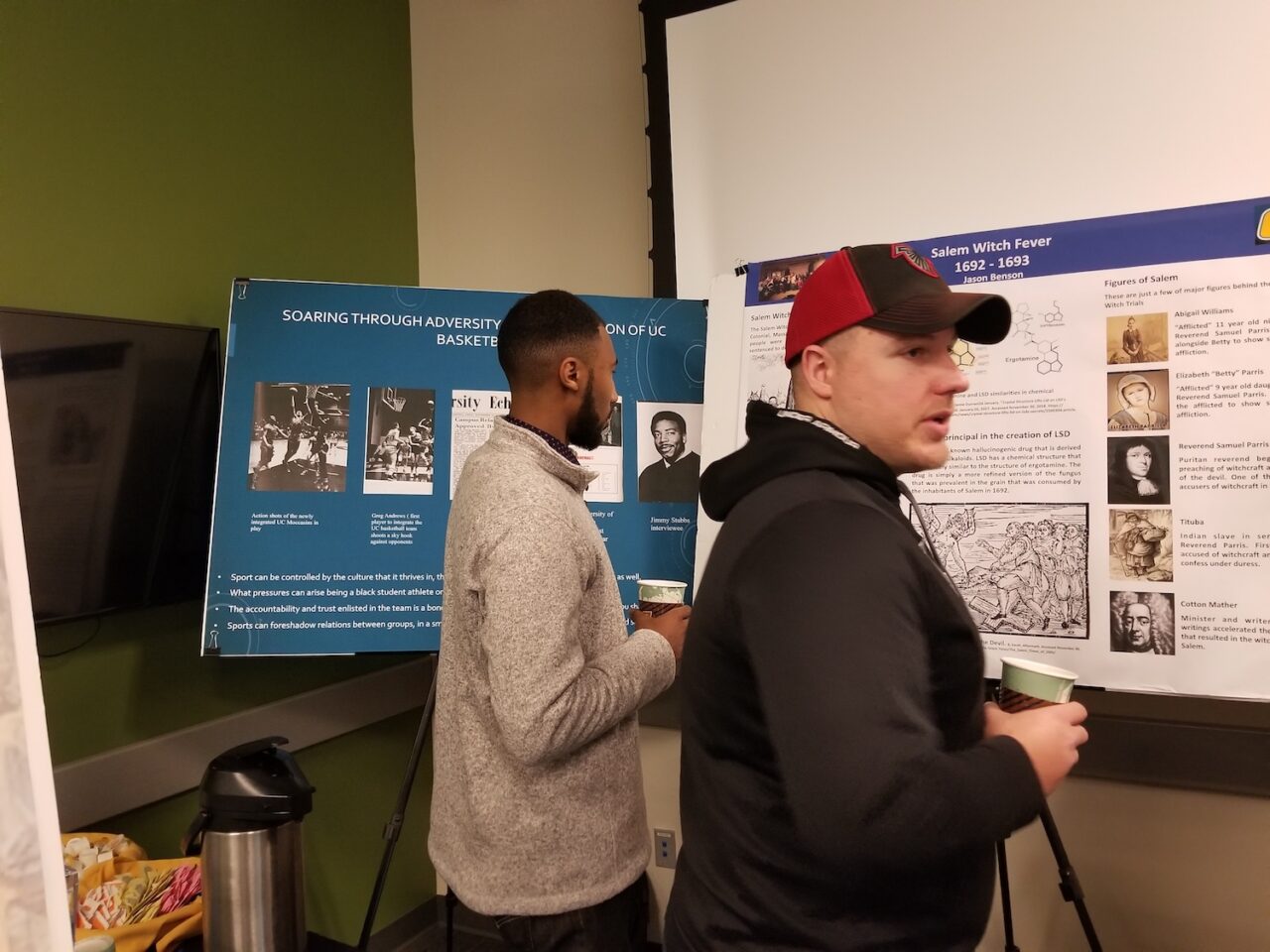 At the end of the Fall 2018 semester, students from sections 0 and 03 of Writing and Research in History showcased the posters they created for the class. The course was designed to help students learn to evaluate primary and secondary materials and use those sources to develop and answer research questions. Students in the class were required to complete a historical research paper on a topic of their choice. In addition, they created posters depicting the major points of their research project. Students then presented these posters during two conference-like sessions, attended by faculty and staff from the Department of History and others.