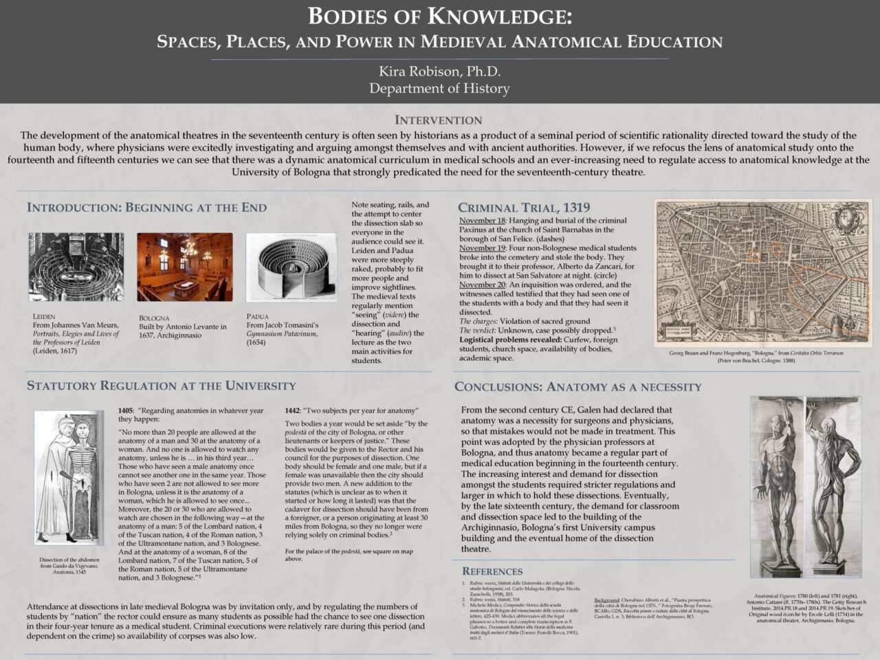Prof. Robison has nearly completed her book manuscript, Healers in the Making: Students, Physicians, and Medical Education in Medieval Bologna (1250-1550).