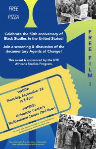 Are you interested in learning about social movements, intersections of race and education, and the production of social documentaries? If so, join a screening and discussion of Agents of Change on Thursday, September 26, starting at 5pm in the Multicultural Center, 3rd Floor, University Center. Film director and producer Abby Ginzberg will talk via Skype about producing the documentary and the history of the first Black Studies programs in the United States.