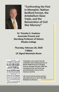 The lecture is titled “Confronting the Past in Memphis: Nathan Bedford Forrest, the Antebellum Slave Trade, and the Reinvention of Civil War Memory,” and will focus on how new research into the antebellum slave trading operations of Forrest is changing how we remember the past, while also revealing how the Lost Cause long dominated public memory of the American Civil War.