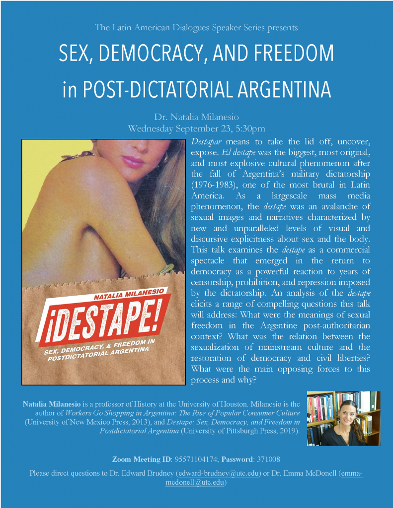 Destapar means to take the lid off, uncover, expose. El destape was the biggest, most original, and most explosive cultural phenomenon after the fall of Argentina’s military dictatorship (1976-1983), one of the most brutal in Latin America. As a largescale mass media phenomenon, the destape was an avalanche of sexual images and narratives characterized by new and unparalleled levels of visual and discursive explicitness about sex and the body. This talk examines the destape as a commercial spectacle that emerged in the return to democracy as a powerful reaction to years of censorship, prohibition, and repression imposed by the dictatorship. An analysis of the destape elicits a range of compelling questions this talk will address: What were the meanings of sexual freedom in the Argentine post-authoritarian context? What was the relation between the sexualization of mainstream culture and the restoration of democracy and civil liberties? What were the main opposing forces to this process and why?