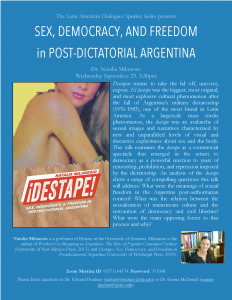 Dr. Natalia Milanesio (University of Houston, Dept. of History) gave a fascinating talk on the breakdown of censorship laws in Argentina in the 1980s following the collapse of the most recent military dictatorship (related to her recent, award-winning book Destape: Sex, Democracy, and Freedom in Postdictatorial Argentina).