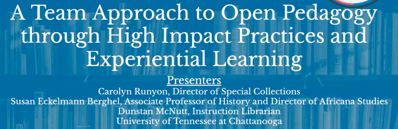 Alongside Carolyn Runyon, Director of Special Collections, University of Tennessee at Chattanooga, and Dunstan McNutt, Instruction Librarian, University of Tennessee at Chattanooga, Dr. Eckelmann Berghel provided an overview of more than five years of collaborations between the Department of History, Special Collections, and the Library’s Research and Instruction unit at the University of Tennessee at Chattanooga to create open pedagogy projects for undergraduate students using high impact practices and experiential learning opportunities.