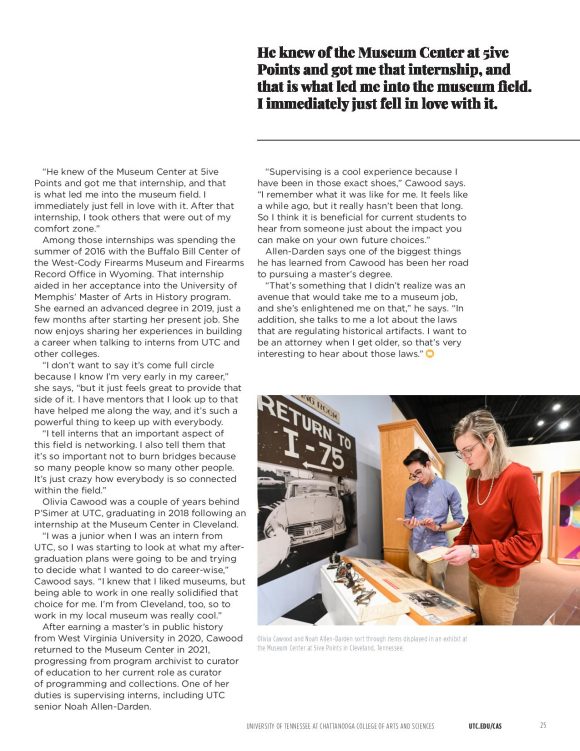 “I was a junior when I was an intern from UTC, so I was starting to look at what my after- graduation plans were going to be and trying to decide what I wanted to do career-wise,” Cawood says. “I knew that I liked museums, but being able to work in one really solidified that choice for me. I’m from Cleveland, too, so to work in my local museum was really cool.”