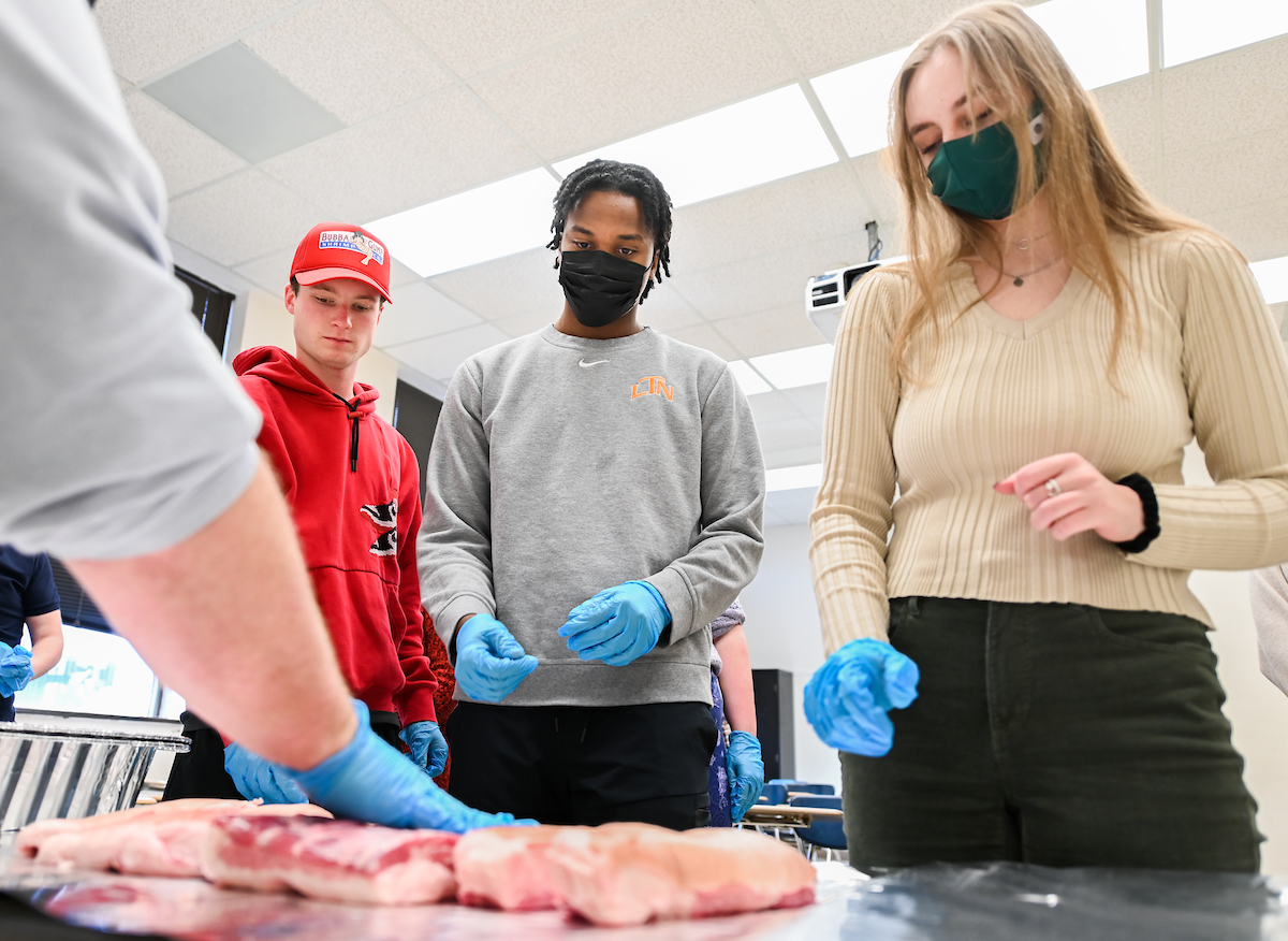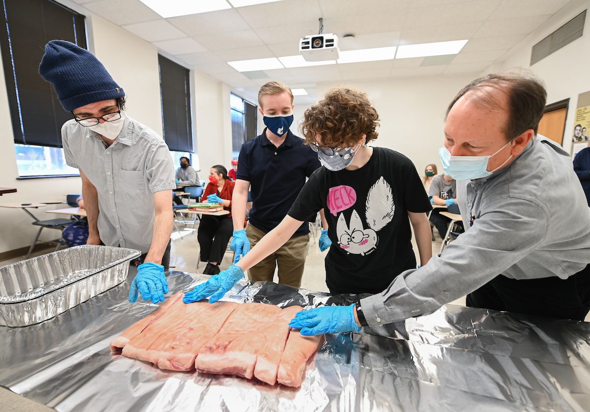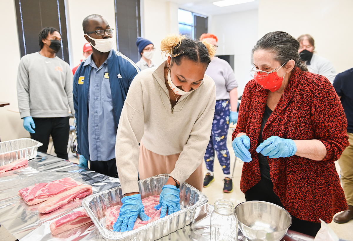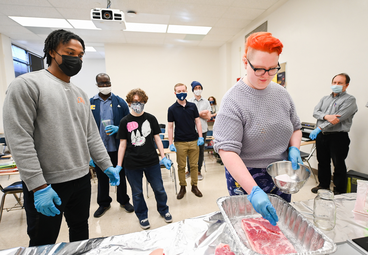 Students in Mark Johnson’s ‘Food and Southern History’ class prepare a chunk o’park for curing bacon.