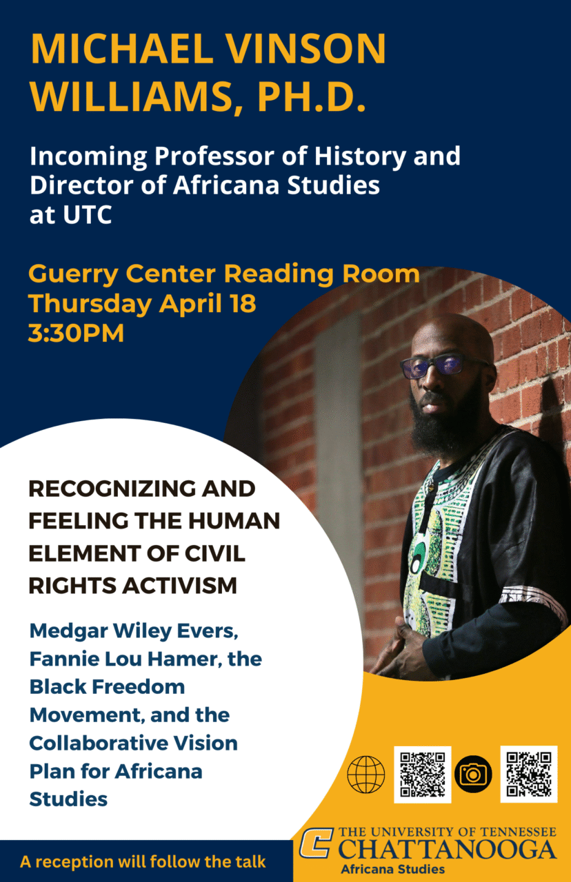 Incoming Professor of History and Director of Africana Studies, Dr. Michael Vinson Williams, will give a talk and meet members of the community at an event on Thursday April 18 at 3:30PM. He will deliver a talk entitled “Recognizing and Feeling the Human Element of Civil Rights Activism: Medgar Wiley Evers, Fannie Lou Hamer, the Black Freedom Movement, and the Collaborative Vision Plan for Africana Studies.” The talk will be followed by a reception with refreshments. Please come welcome Dr. Williams to Chattanooga and celebrate this milestone for UTC’s Africana Studies program. Read more about Dr. Williams at www.utc.edu/africana and https://tinyurl.com/3jssp4cx.