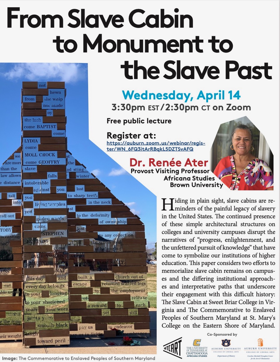 “From Slave Cabin to Monument to the Slave Past,” Wednesday, April 14 @ 3:30pm EST, Dr. Renée Ater, Provost Visiting Professor, Africana Studies, Brown University