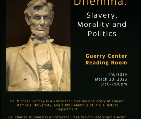 UTC’s History Department is thrilled to welcome back to campus 1980 program alumnus Dr. Michael Toomey, who will join visiting scholar Dr. Charles Hubbard for a discussion of “Lincoln’s Dilemma: Slavery, Morality and Politics” on Thursday, March 30th from 5:30-7:00pm in the Guerry Center Reading Room.