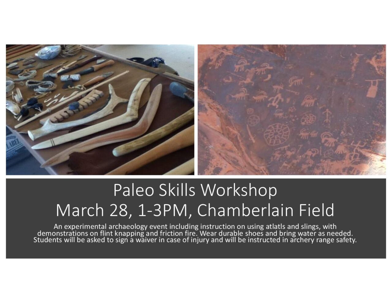 An experimental archaeology event including instruction on using atlatls and slings, with demonstrations on flint knapping and friction fire.