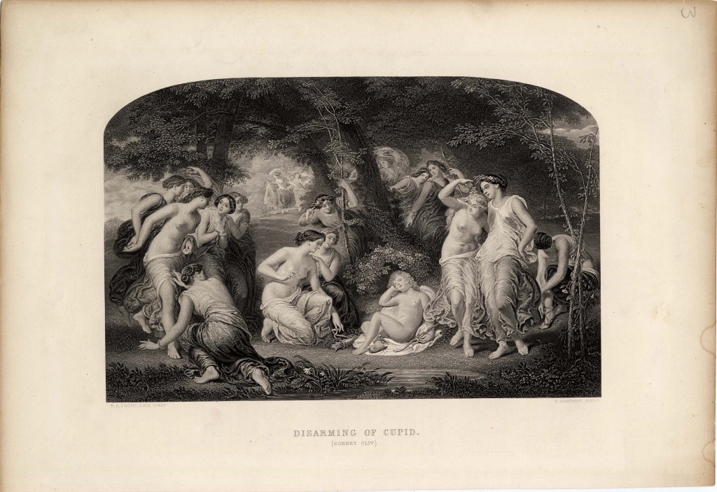 This print of The Disarming of Cupid resides in the Special Collections (along with dozens of other Shakespearean prints). It is a steel-plate engraving, crafted by William Edward Frost in 1850, and was likely taken from Charles Knight’s two-volume Imperial Edition of The Works of Shakespere (London: Virtue and Company, 1873-76). The original Disarming of Cupid is part of the Queen’s Royal Collection. The print is an illustration of Shakespeare’s 154th Sonnet which appears below in its entirity: