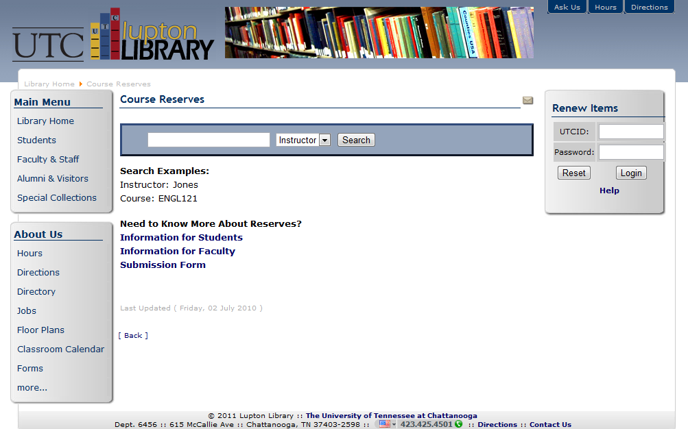 Course Reserves – why do I need them, how can I put things on reserve, how do I get them back? Reserves are great for giving your class access to items they may not otherwise be able to find or to afford. Putting things on reserve also expands the resources you can assign to support your syllabus, since the items are free and easy for the students to use. There are two kinds of Reserves: physical and Electronic Reserves. Books, movies, CDs, and other items can all be put on physical reserve and are held behind the Circulation Desk (to the left when you enter the library). Electronic Reserves are articles, database links, or excerpts from books that we scan and enter into the computer. Your students can access them from any computer at any time so they’re very convenient.