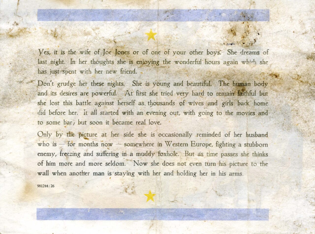 This particular leaflet was dropped in Ardennes but was likely dispersed on other fronts as well and targeted American troops. These sexualized leaflets were meant to lower the morale and resolve of Allied soldiers in the war by playing upon the notion that their wives were bored and unfaithful, but more often served as pin-up pictures rather than demoralizers. Leaflets were also dropped on British troops that detailed how the American soldiers were taking the Brits’ women while they were on the warfront. Very few of these leaflets survived. They were made of very poor quality paper and it is even rumored that soldiers used them as toilet paper. (For a short and interesting read on propaganda usage in World War II, see the PBS website on the Ken Burns’ documentary The War.)