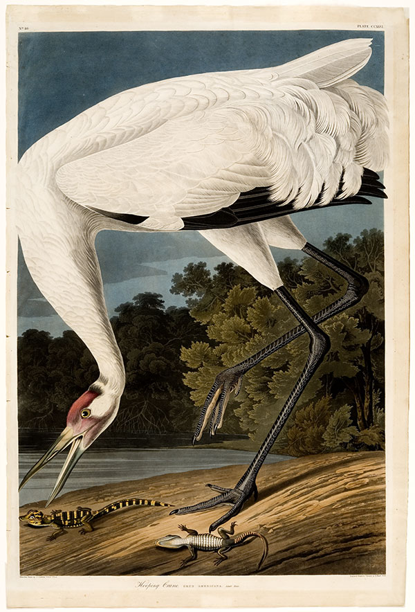 There are many illuminating tidbits about Audubon’s creations from Birds of America. For example, he was able to recreate the intricacies of each species in large part through specimens that he shot, wired, and propped in lifelike positions. (I would like to add, however, that Audubon was meticulous in his observations of the behaviors of the living birds as well and, in my mind, this was the critical component to his interpretations.) What surprised me however (and I would have caught this detail if it wasn’t right in front of my face the entire time), is that all of Audubon’s birds of America are life-sized. Even the large birds-eagles, cranes, the California condor-are portrayed at full size. To accomplish this feat, Audubon had to bend or contort some of the birds to fit them on the page but in doing so never caused them to look unnatural. Such a visually stunning and intelligent body of work!