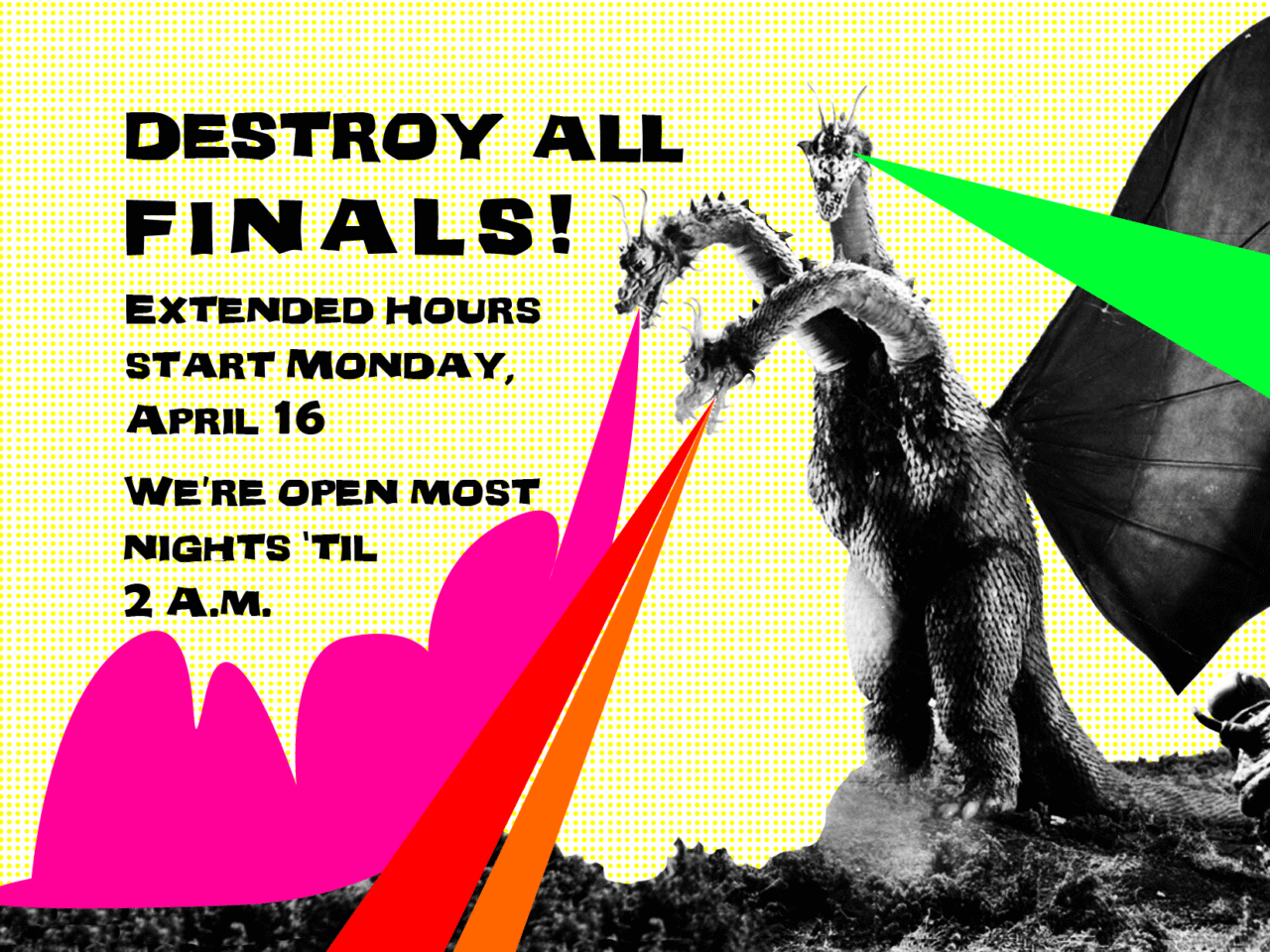 Now you could put off the work and wrap up in a flurry of mediocre last-minute haste. Or you could just give up and let the universe do what it will. Or you could take charge of your finals destiny like a … like a … three-headed dragon that shoots freaking lasers from two of your mouths and, apparently, one of your left eyes … for some reason.