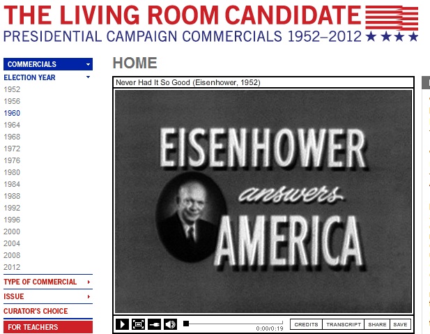 While I wouldn’t put the material on The Living Room Candidate in the same class of kitsch and cool as mid-century magazine advertisements, it provides thought-provoking examples of presidential campaign television commercials during the infancy of the medium. The site, produced by the Museum of the Moving Image, includes presidential campaign commercials from 1952 to 2012; with 1952 marking the first year that televised commercials were used during presidential campaigns. Everyone gets a fair shake on The Living Room Candidate: Democrat, Republican and, sometimes, Independent candidate commercials are featured.