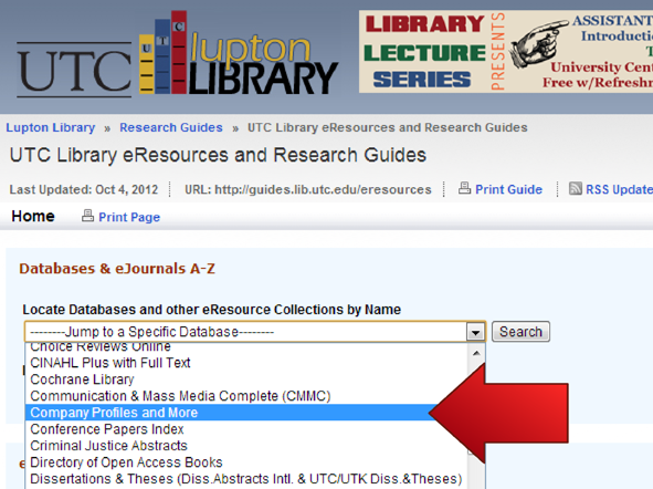 Step 1: Click the “Articles and Databases” link on the library home page. In the first drop box, select “Company Profiles and More” (see below) and click “Search.” This will take you directly to the Company Profiles section of LexisNexis. Of course, you may also select the LexisNexis database in the drop box and click the blue “Companies” then “Company Profiles” links on the left side of the LexisNexis home page.