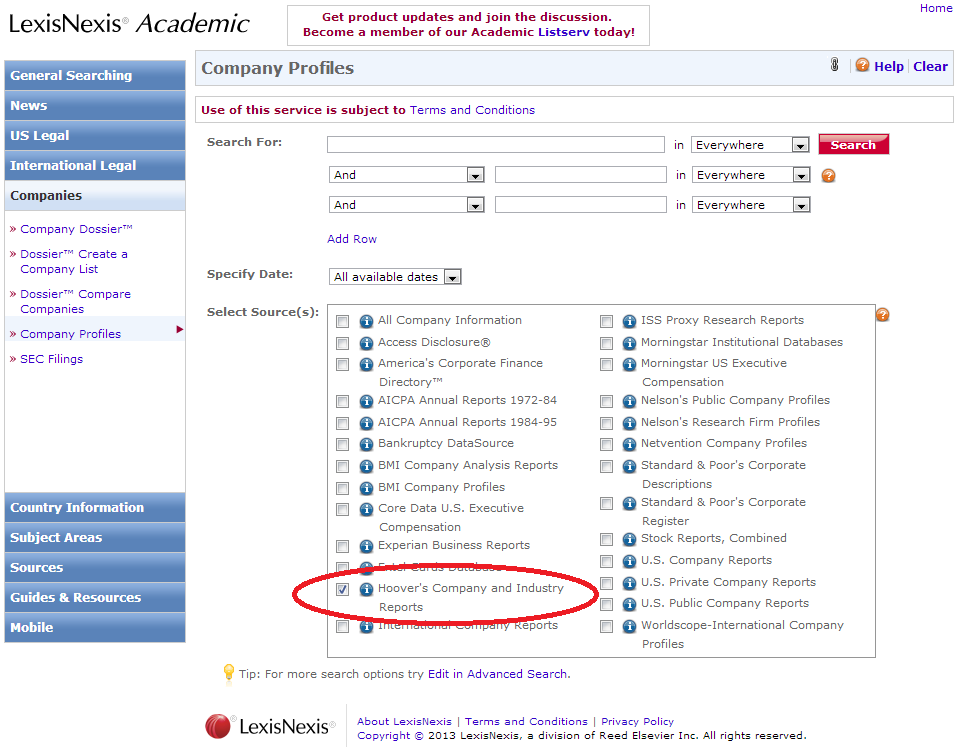 Step 2: Click the “Hoover’s Company and Industry Reports” check box in the middle of the screen (see below) and search away! Blammo!