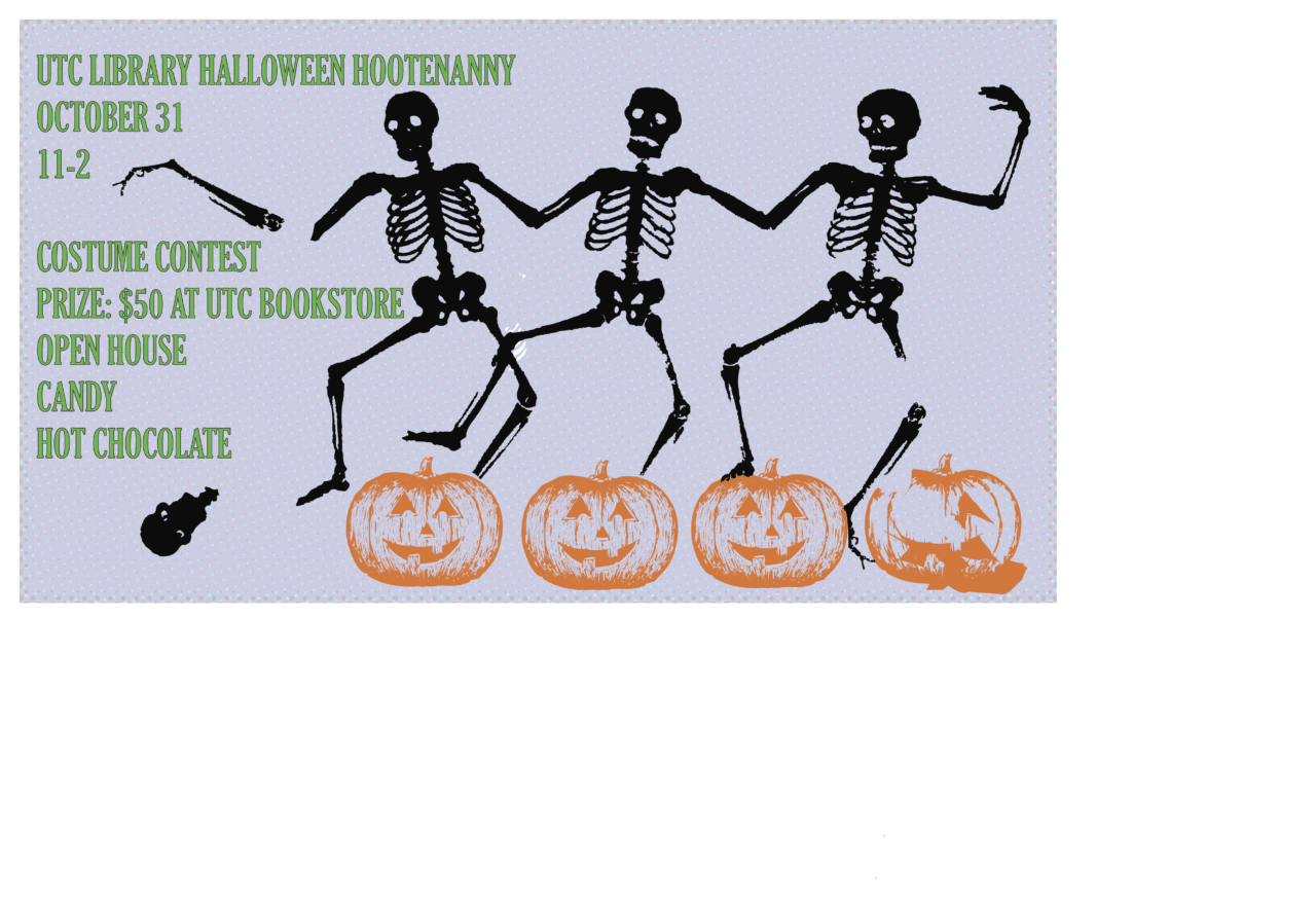 On Halloween, stop by the UTC Library from 11am - 2pm and enjoy: Candy Hot Chocolate Prizes Games Costume …