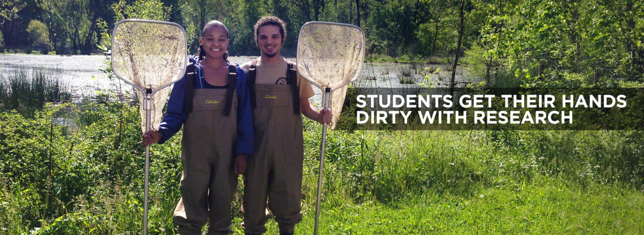 Former UTC undergraduate Patsy Thrasher and current UTC graduate student Elijah Reyes collecting giant water bugs to study mating and parental care behavior. Their work was recently published in the journal Ethology.