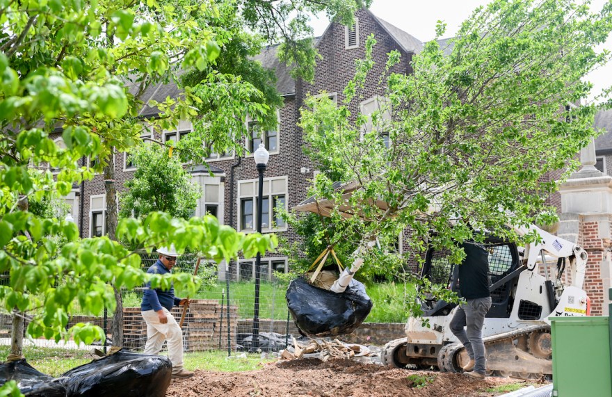 Workers are getting ready to plant new trees along Vine Street next to Founders, Race and Hooper Halls.