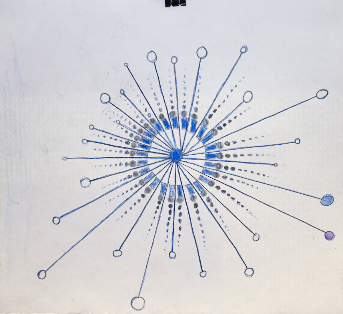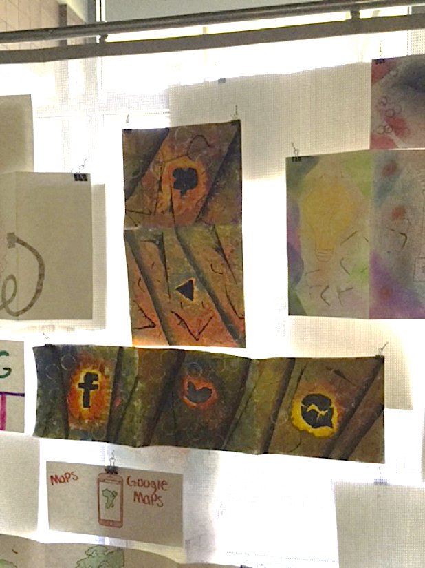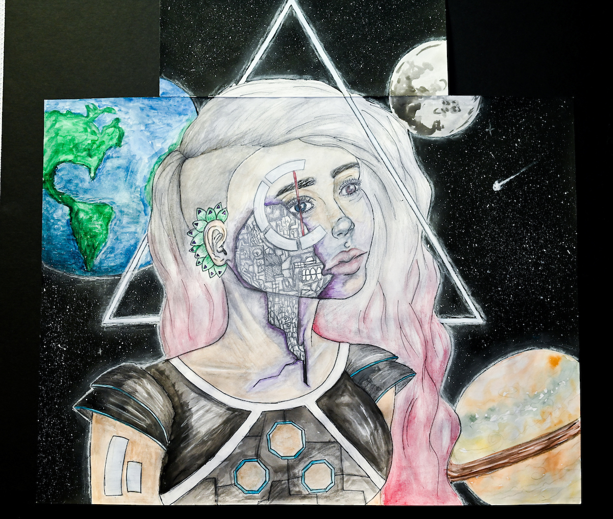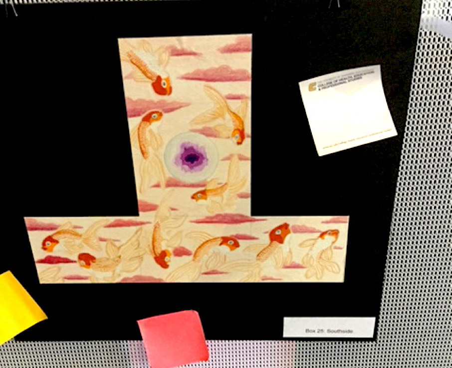 A sophomore at CCA, Lily used colored pencils and markers to create a highly-detailed display of goldfish swimming through an environment of clouds and around a purple-centered circle.