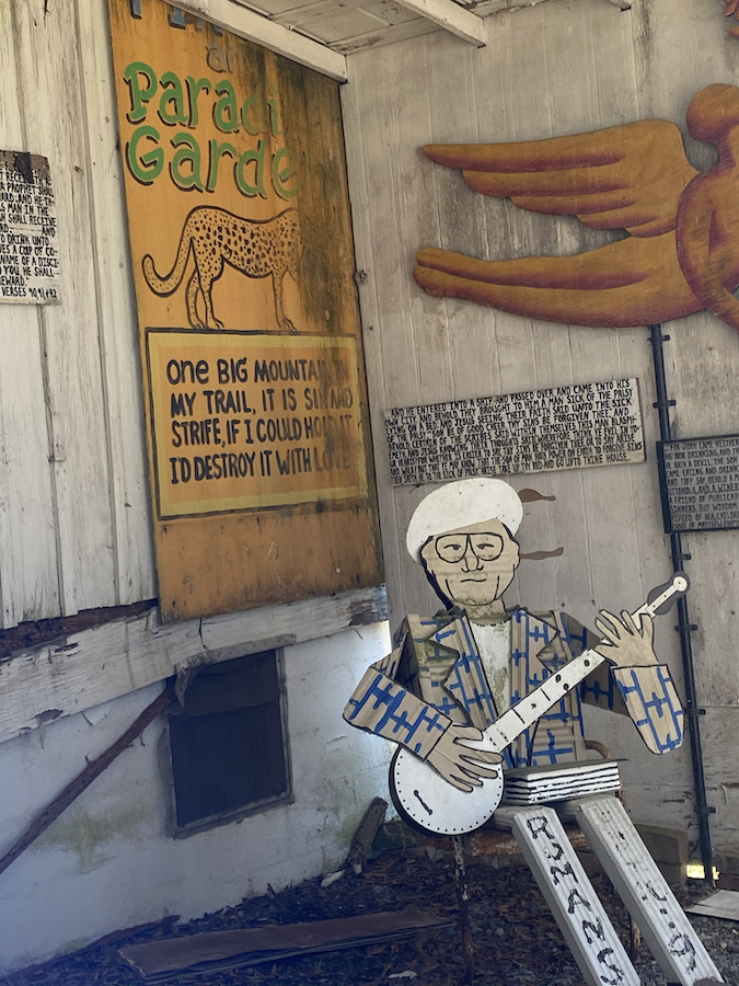 “What struck me,” Dodge said, “is I just liked the words he used. ‘One big mountain in my trail, it is sin and strife. If I could hold it, I’d destroy it with love.’ I just really like that quotation. The way it’s on a sign for Paradise Garden was almost like an advertisement. And it’s behind a self-portrait because he played banjo, I’m assuming.